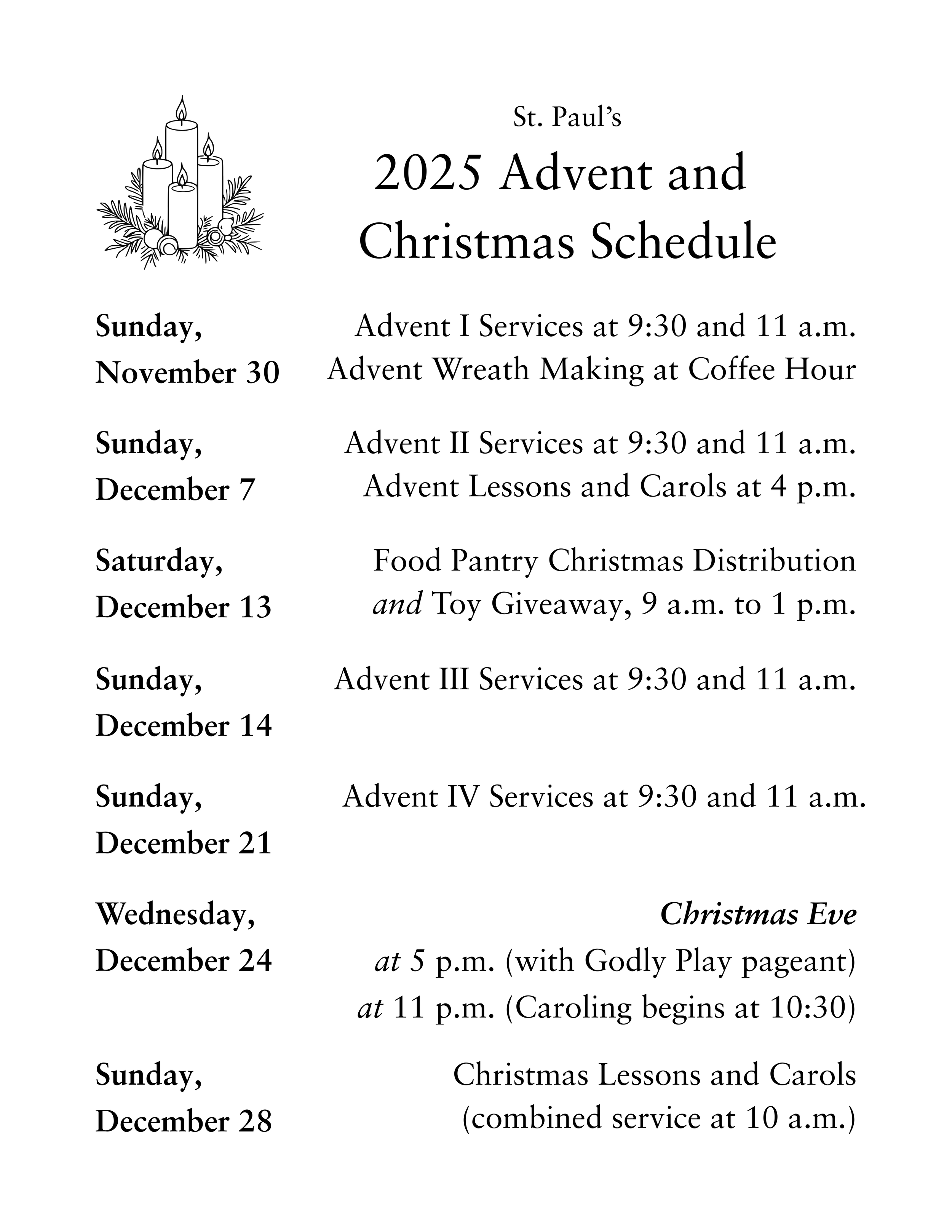 For more information about Advent and Christmas at St. Paul’s, please contact the Office.